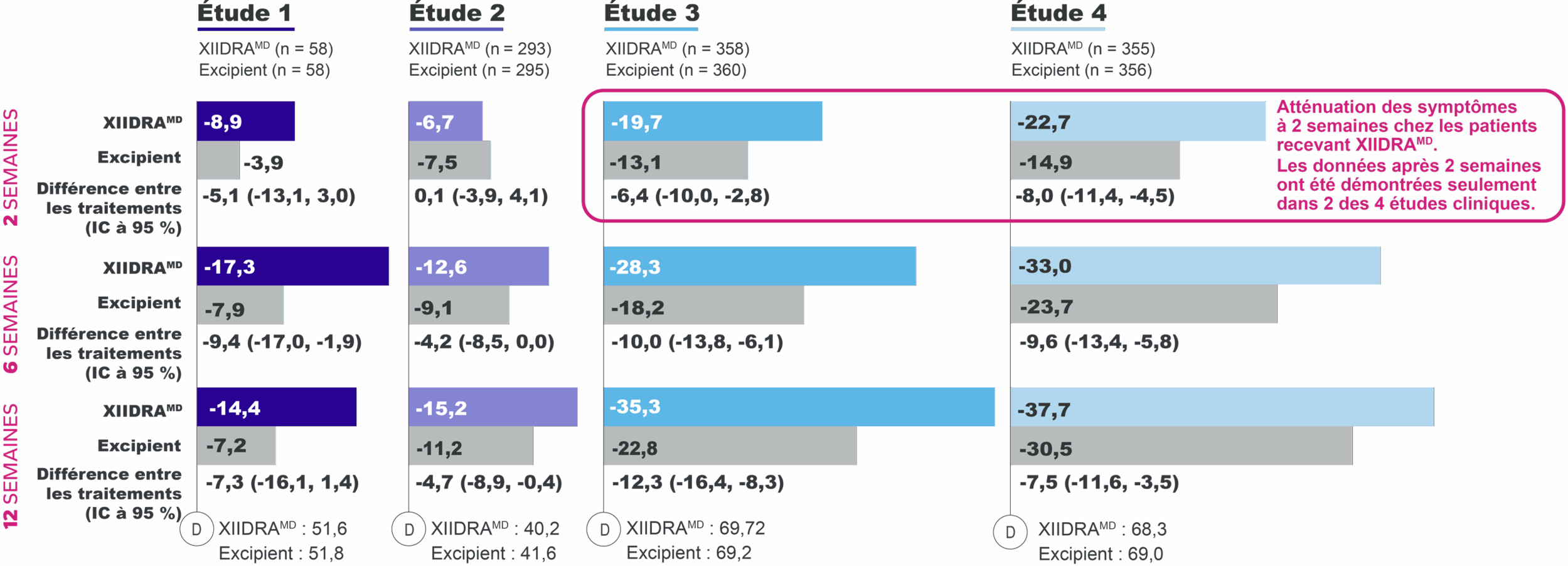 Dans les 4 études, une différence entre les traitements en faveur de XIIDRAMD comparativement à l’excipient a été observée après 6 et 12 semaines¹. Les valeurs initiales du SSO pour l’excipient et pour XIIDRAMD étaient, respectivement, de 51,8 et 51,6 dans l’étude 1, de 41,6 et 40,2 dans l’étude 2, de 69,2 et 69,7 dans l’étude 3, et de 69,0 et 68,3 dans l’étude 41-5.